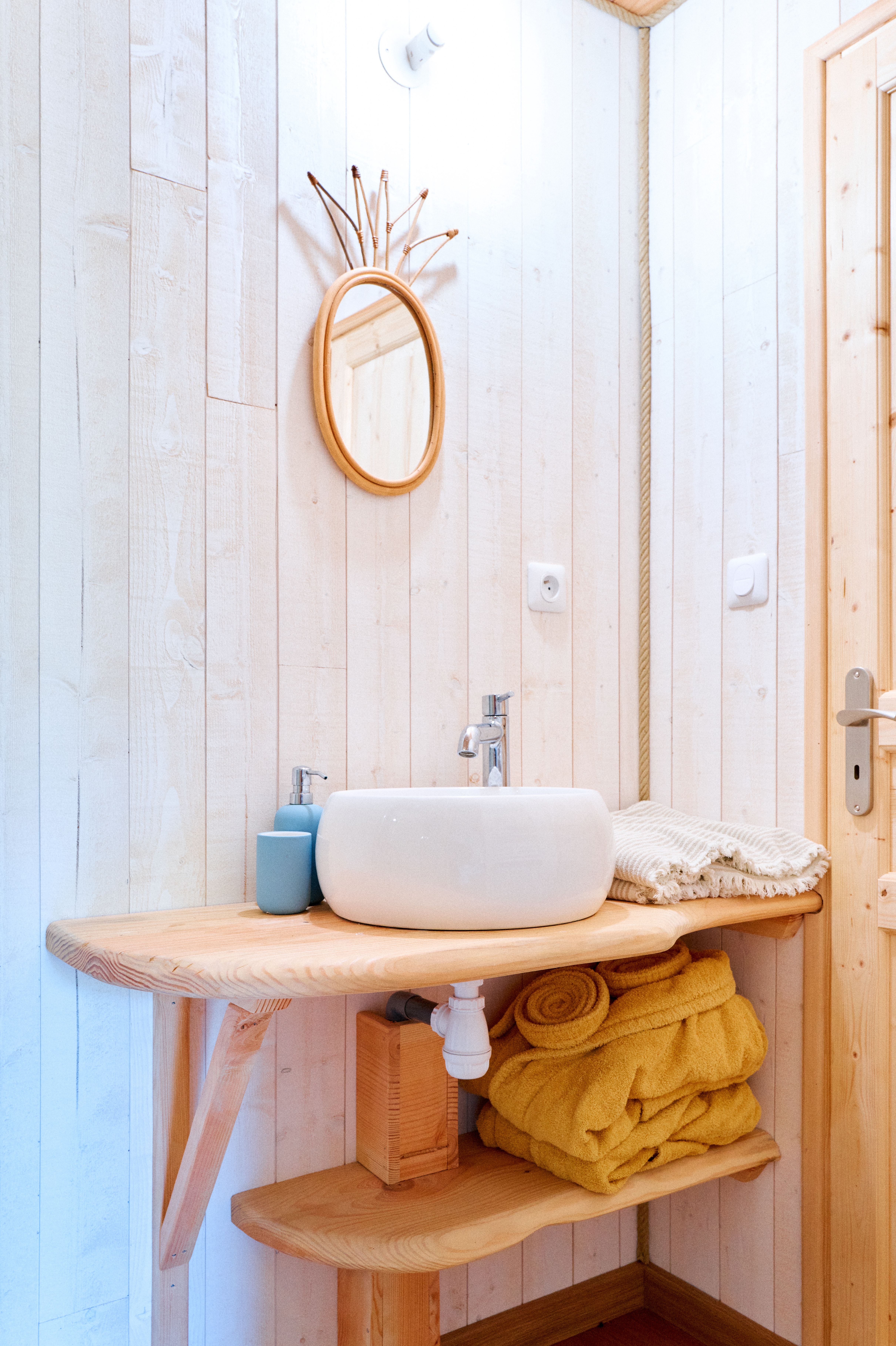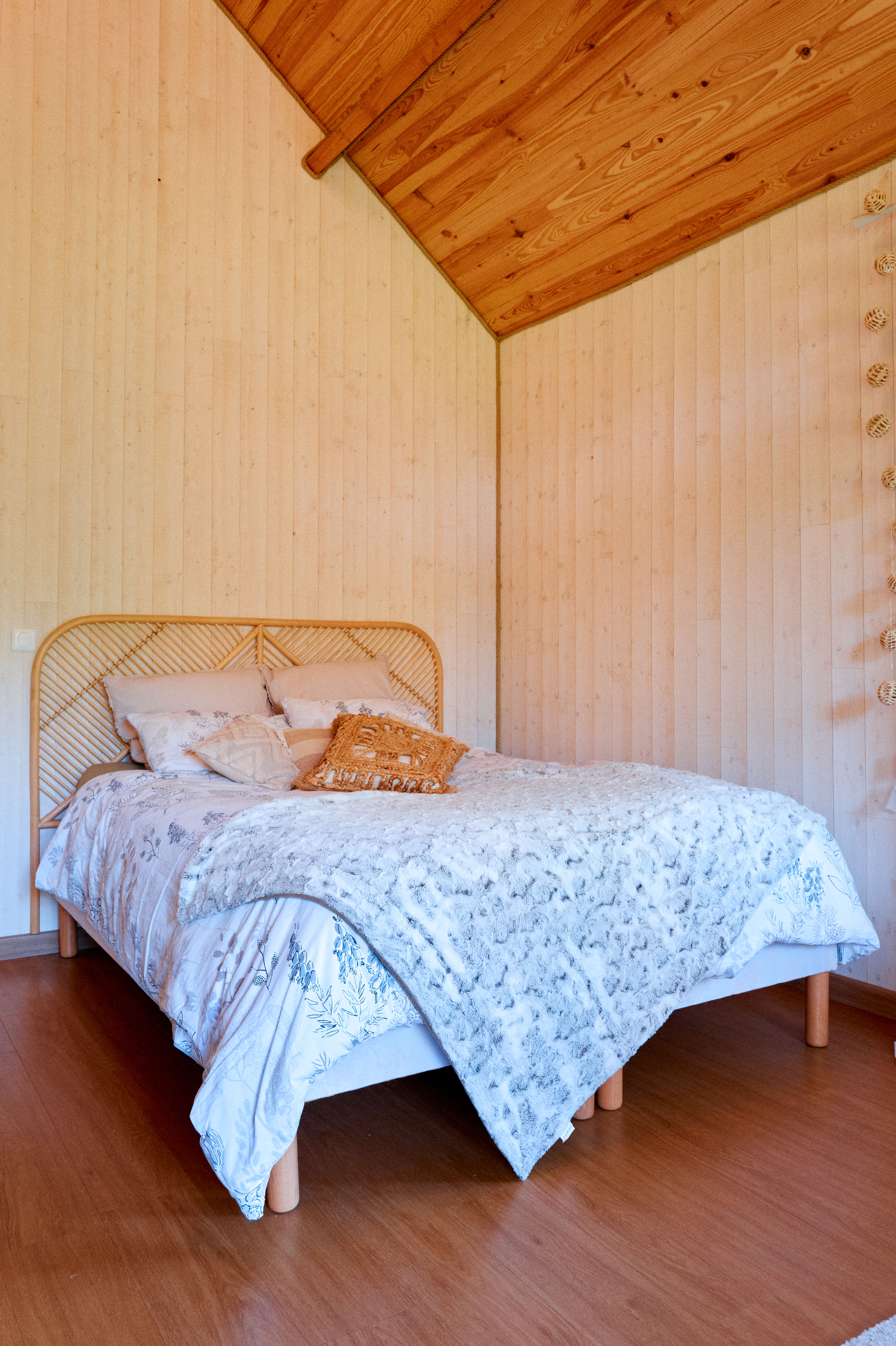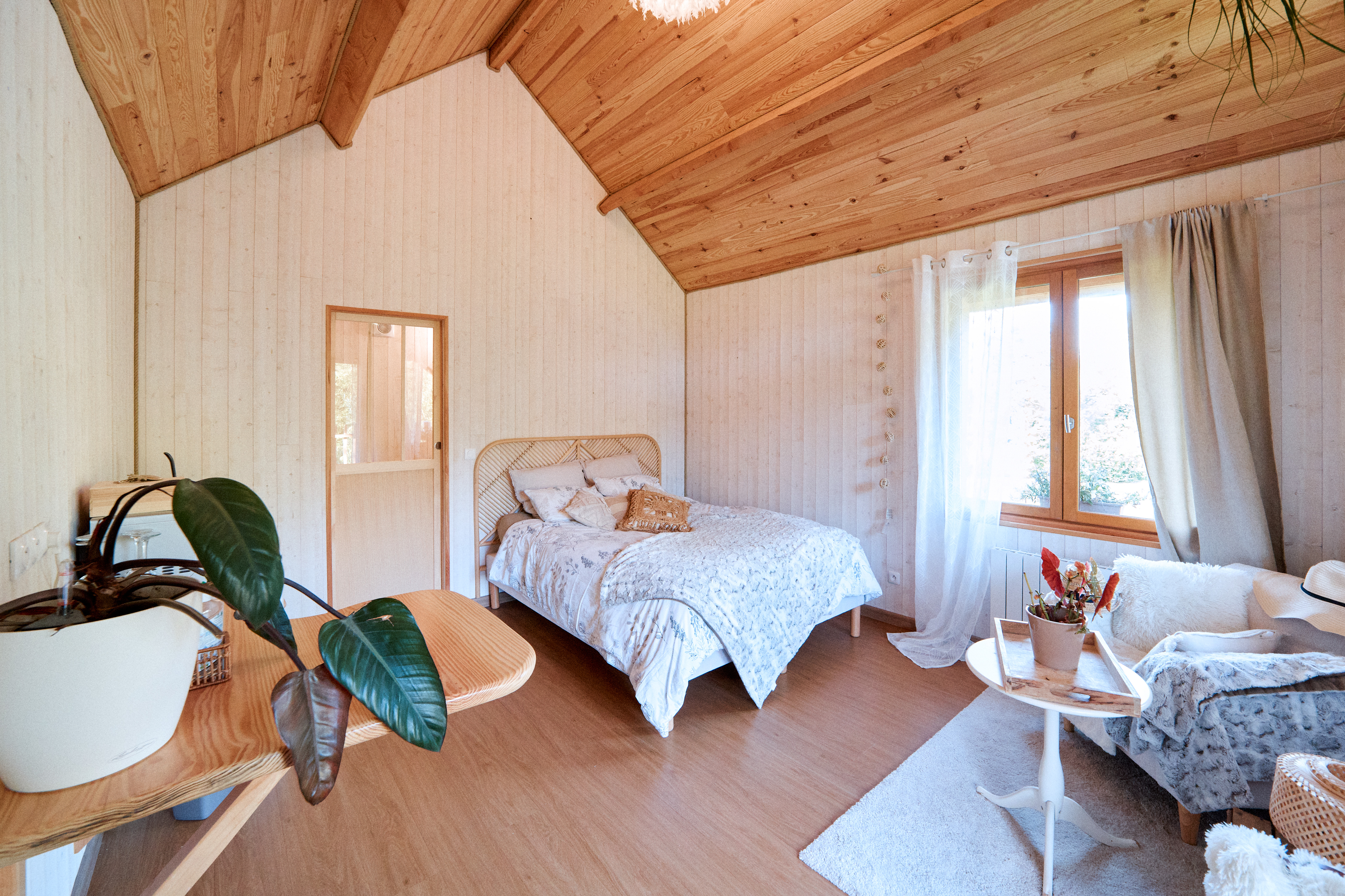 À l’intérieur, l’ambiance est douce et chaleureuse. Les matériaux naturels, les textures douillettes et la décoration soignée créent une atmosphère cosy et apaisante, parfaite pour se ressourcer.